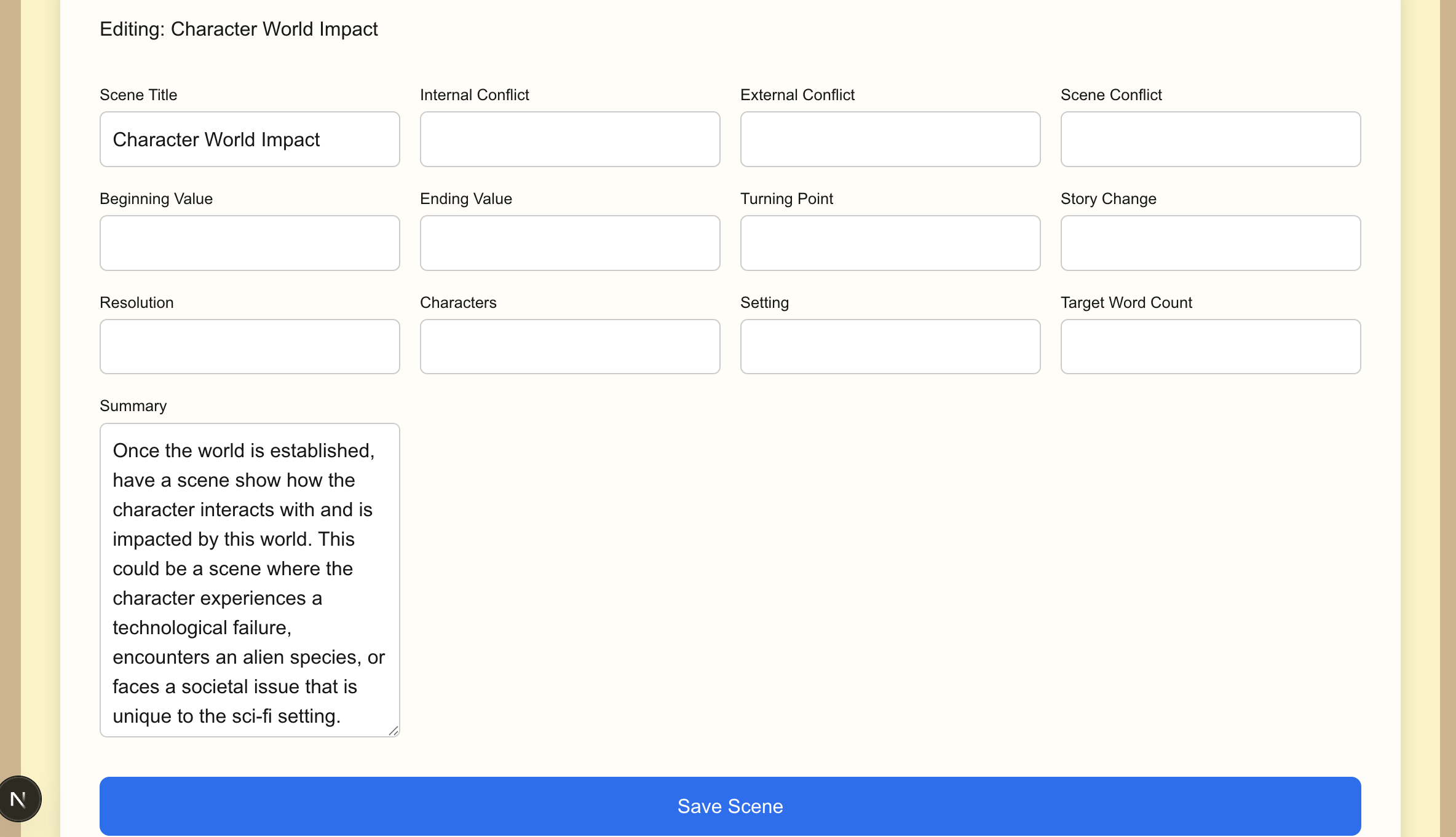 Whether you're a novelist, screenwriter, or game designer, the Scene Builder is a powerful tool for crafting compelling stories. Signup or login below to start building your stories.