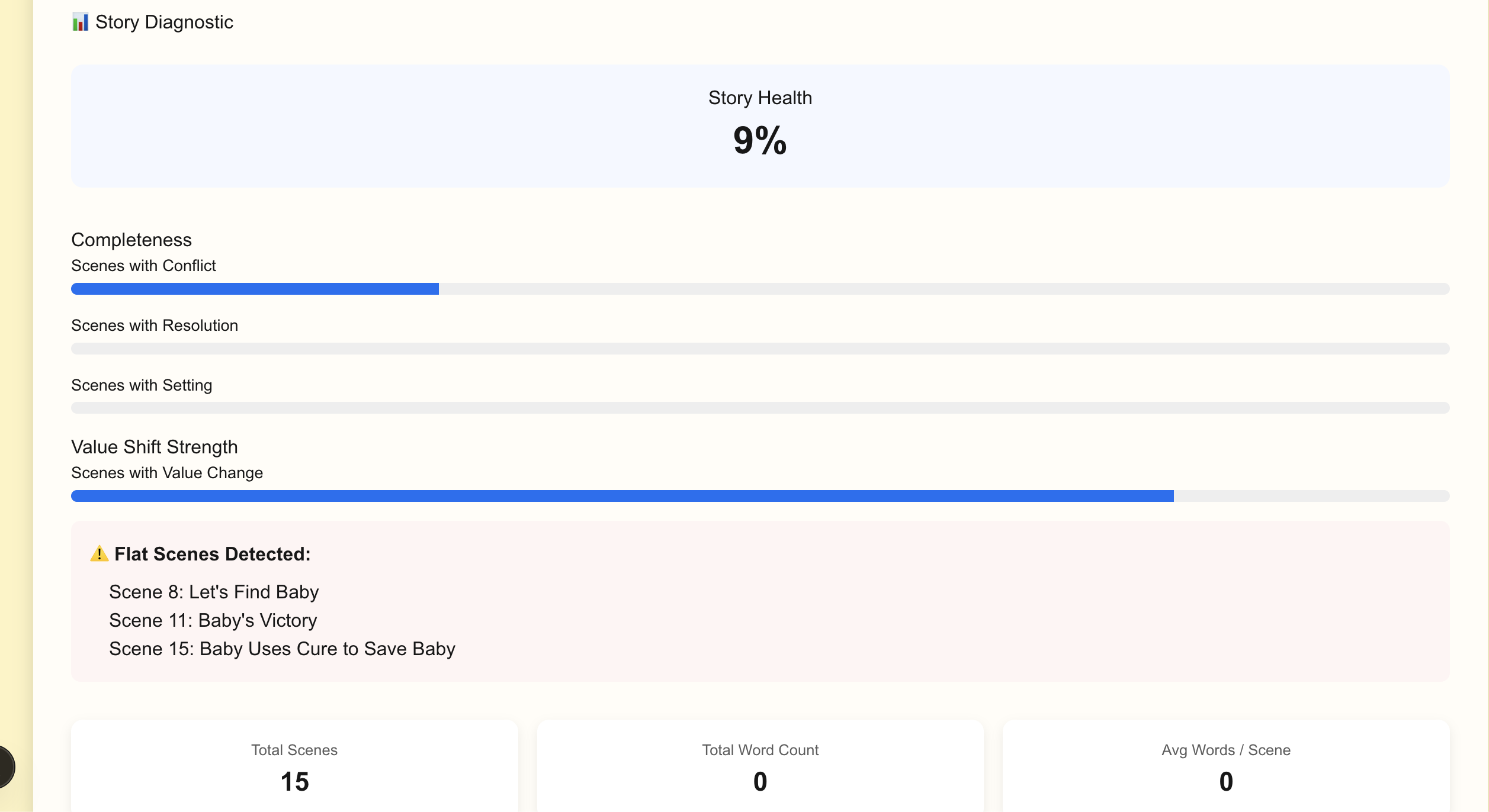 Once you have built your scenes, you can organize them into a cohesive narrative structure. For help pinpointing potential problem areas, the Scene Builder comes with a narrative analysis feature that uses the details of your scene to determine where your pacing is too fast or slow, where your conflicts and resolutions are, and more.